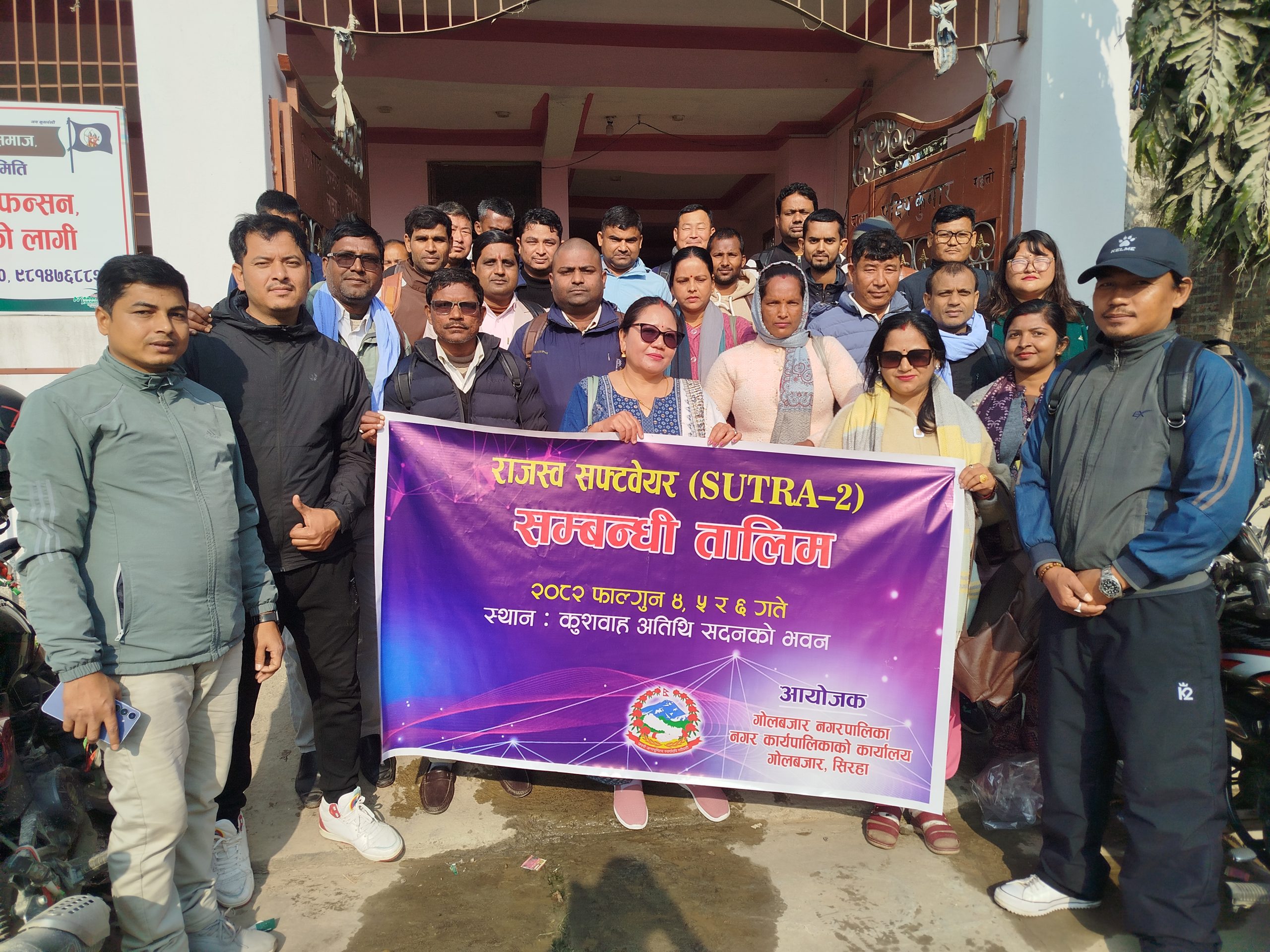 सिरहा – गोलबजार नगरपालिकाले सुत्र प्रणाली सम्बन्धी तीन दिने तालिम सम्पन्न गरेको छ। फागुन ४ गतेदेखि सुरु भएको प्रशिक्षण कार्यक्रम फागुन आज समापन भएको हो।