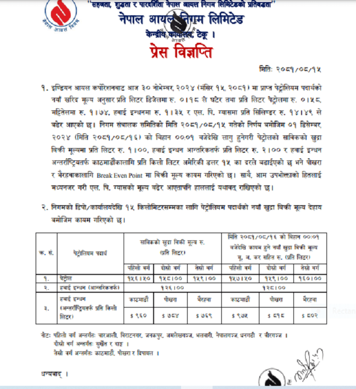 त्यस्तै, हवाई इन्धन (आन्तरिक) प्रतिलिटर १२८ रुपैयाँ पर्नेछ भने अन्तराष्ट्रिय हवाई इन्धन (अन्तर्राष्ट्रिय) काठमाडौंमा ९७५, पोखरामा ८१८ र भैरहवामा ८०२ अमेरिकी डलर पर्नेछ ।