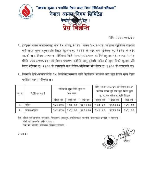 साबिकको खुद्रा बिक्री मूल्यमा प्रति लिटर पेट्रोलमा २ रुपैयाँले बढाइएको तथा डिजेल/मट्टितेलमा प्रति लिटर १ रुपैयाँले घटाइएको छ ।